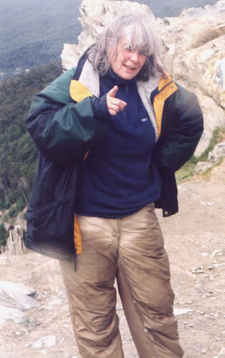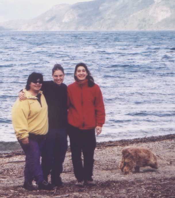 Ibarguchi! This is the last time I break my neck to look for seedsnipes! Monica Abril (Berlingo Team Head Honcho) points an ultimatum in my direction after accompaning me for a tumble down a mountainside through thigh-deep snow & thorns ...(Result: broken camera & binoculars...but look Ma! No broken bones!) | Partial Berlingo Team (and faithful field dog Daisy)...freezing once more, as in most photos, this time in Puyehue, Chile. (L to R: Gladys Guerrero, Gaby Ibarguchi, Gabi Murga) |