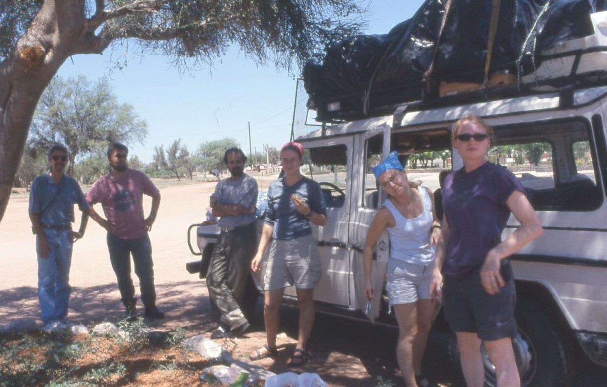 This is what happens when seven live out of a field vehicle...how DARE you ask for your toothbrush on the roof?? And who decided that Roquefort cheese was 'better' than say...Swiss?? We really need a reality show on Day 30 of a field crew...(L to R: Mike Ray, Steve Lougheed, Marcelo Romano, Nina Craig, Daria Koscinski, Emily Croteau) | Beautiful blue skies all around at 3650 m. Marcelo Romano ('Mondongo') enjoys the Altiplano view in Laguna Pozuelos, Argentina, while waiting for our fuel to thaw after a starry but chilly night. | International Shorebird Banding Team 2002 enjoys well-deserved vino tinto after dozens of field hours in knuckle-numbing, cold, furious, damp winds along the shores of Tierra del Fuego. (Foreground L to R: Lily Parra, Allan Baker, Vero Damico, Mark Peck) |